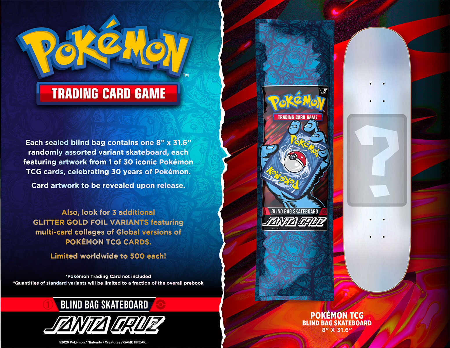 Each sealed blind bag will contain one 8" x 31.6" randomly assorted variant skateboard, each featuring artwork from 1 of 30 iconic Pokémon TCG cards, celebrating 30 years of Pokémon.